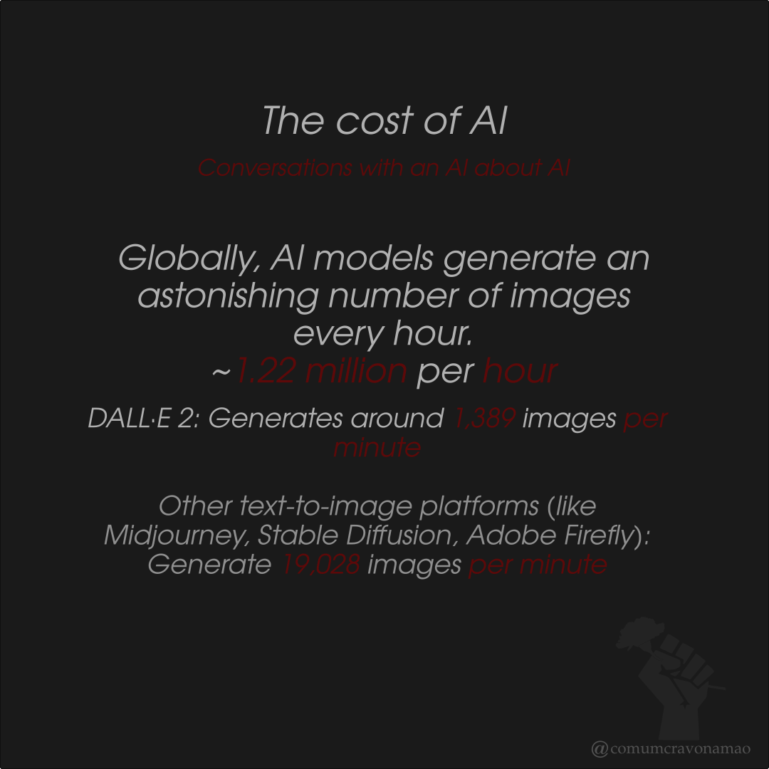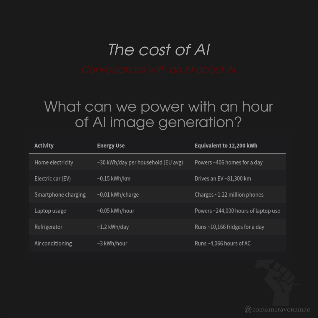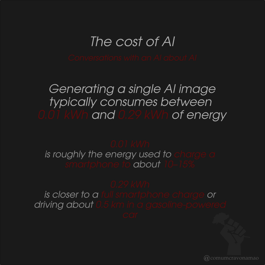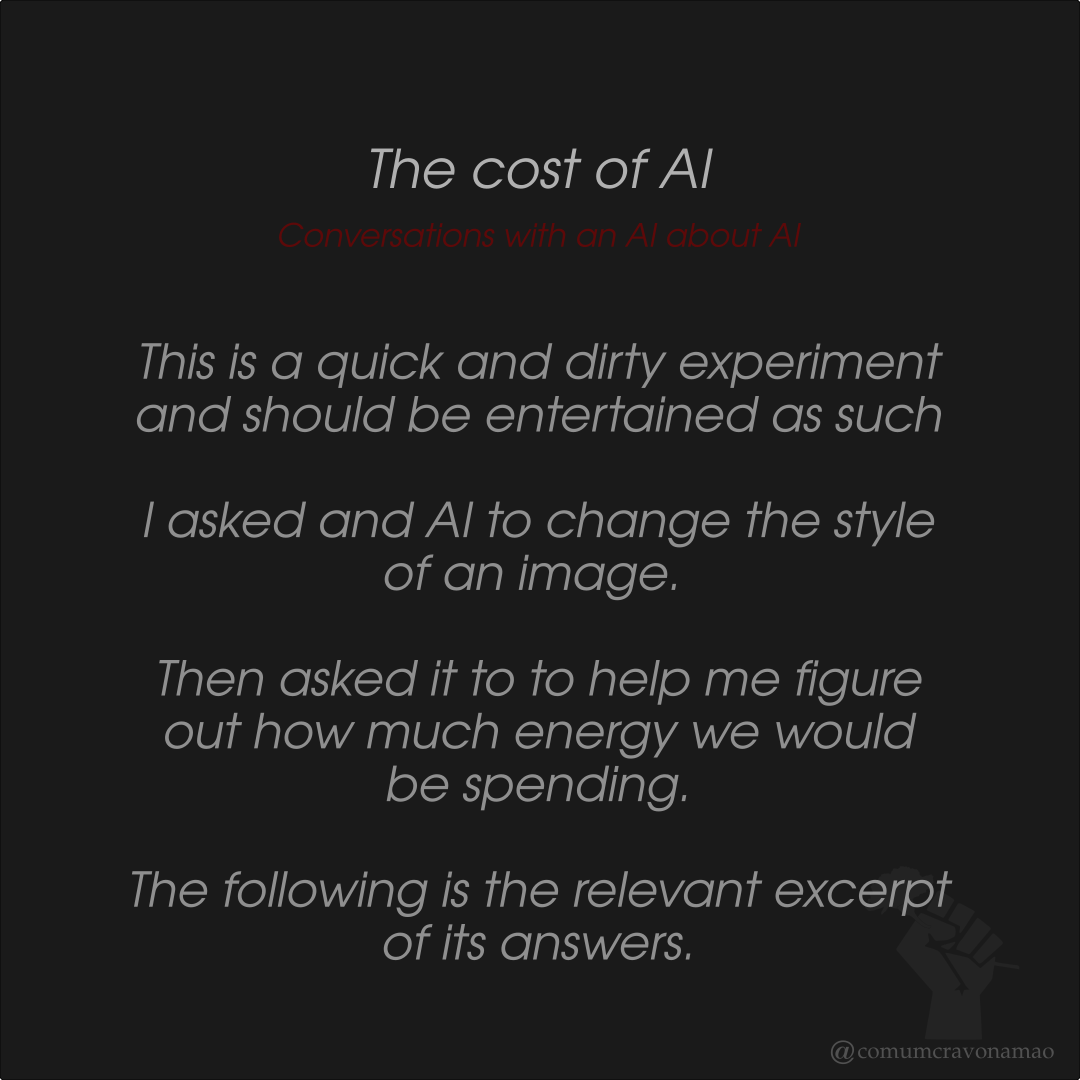 As a trigger I asked and AI (Copilot) to change the style of an image. Then asked it to to help me figure out how much energy we would be spending (wasting) on such endeavor. The following is the relevant excerpt of that conversation.